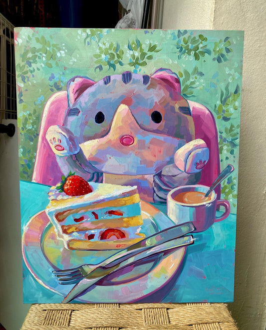 Kitty Plushie Having a Tea Party - Original Oil Painting - Whimsical Art - 16x20 inches