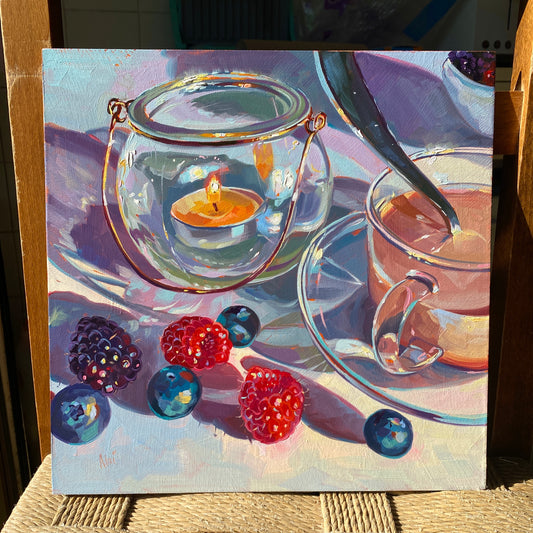 Berries, Coffee, and Candle - Original Oil Painting - Still Life Art - 12x12 inches