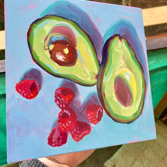 Avocados and Raspberries - Original Oil Painting - 8x8 inches
