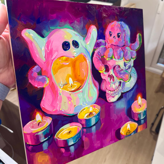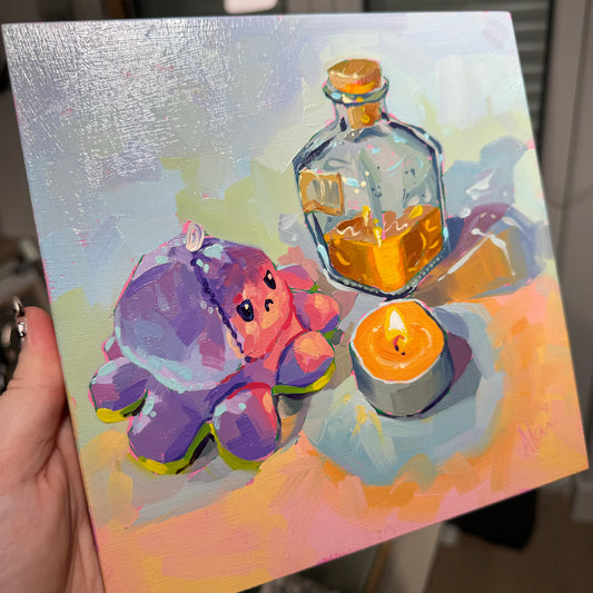 Plushie, candle and bottle - Original Oil Painting - Whimsical Still Life - 8x8 inches