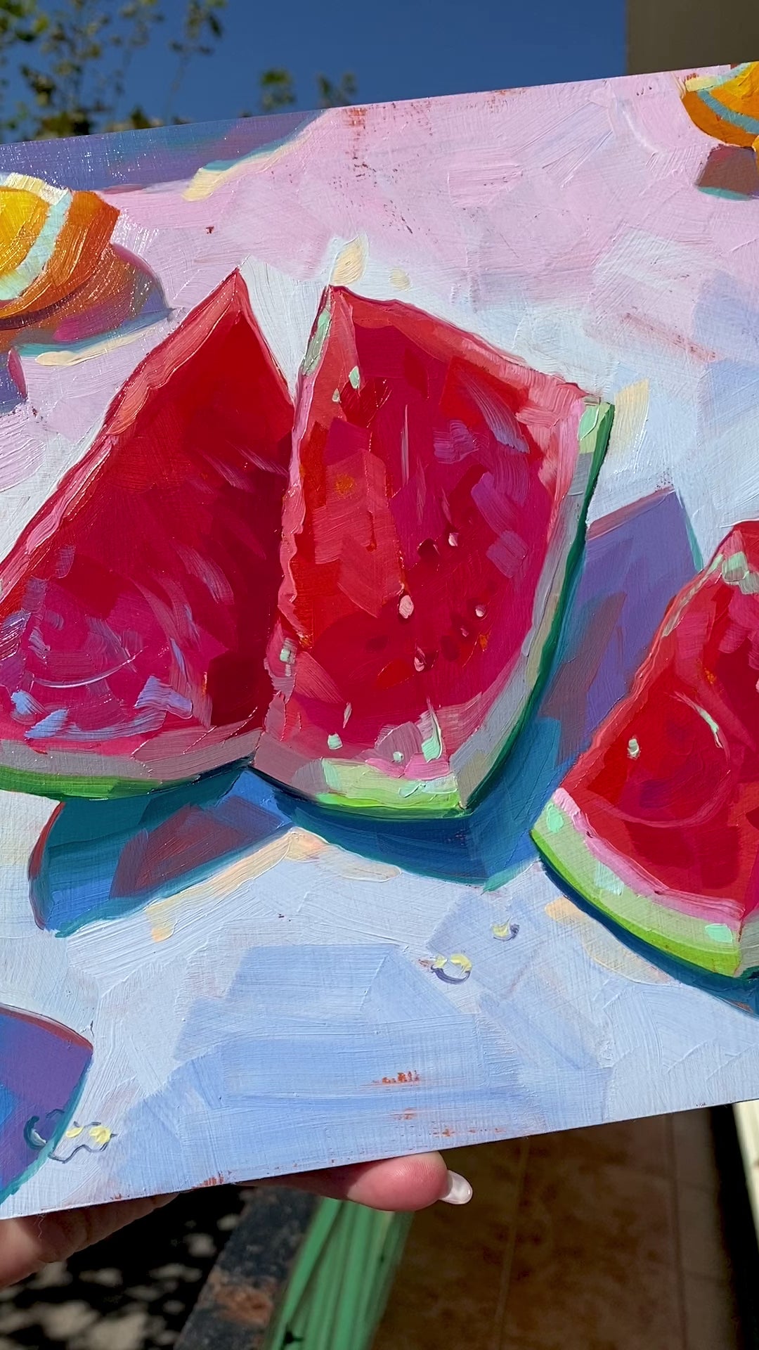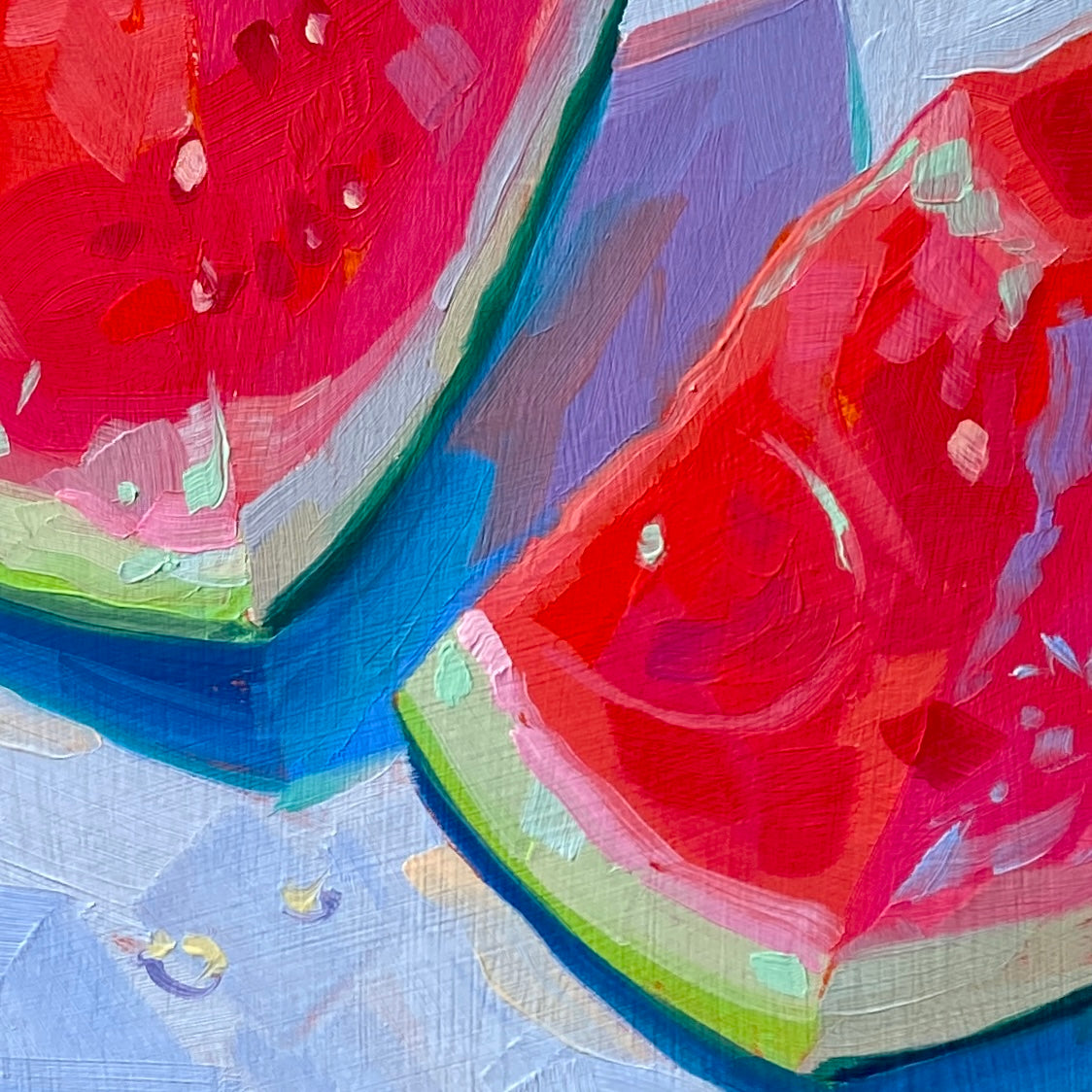 "Cobalt watermelons" is an electrifying original oil painting that captures the bold energy of a sunny afternoon. The composition features three thick, juicy slices of vibrant red watermelon complete with bright green rinds. They rest on a highly textured, pastel lavender surface, but the true magic lies in the light: the fruit casts bold, deep cobalt blue shadows that make the warm red tones vibrate with intensity. Delicate glimpses of sliced oranges in the top corners add an extra pop of complementary citrus color.