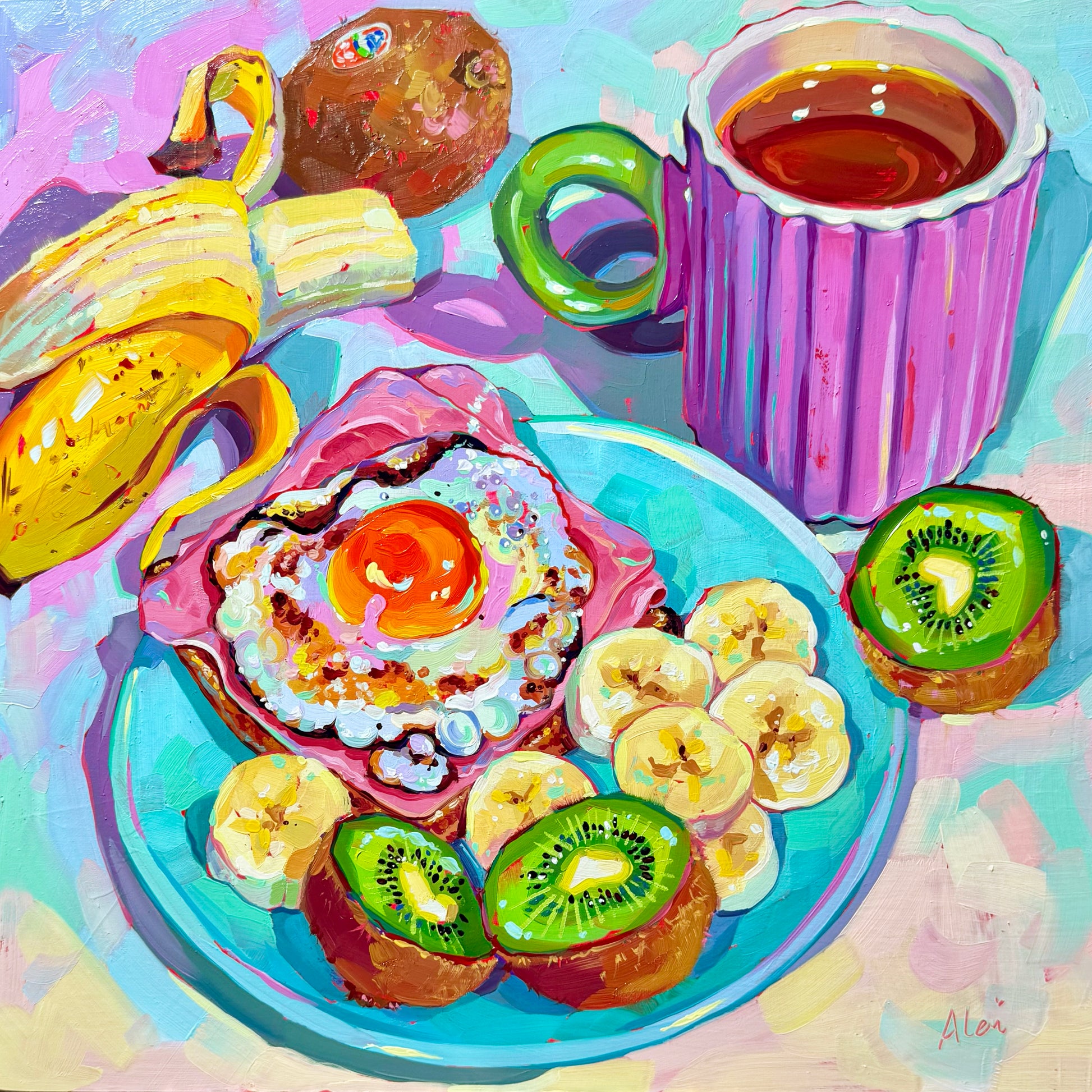 The title comes from the egg: the focal point. Did you realize you can't cook an egg like this? Crispy whites while having a runny yolk? To paint, I love my eggs sunny side up, runny, but to eat... almost over-hard! In this painting, I paint the best of both methods. Now you can get this painting as a renewed print.