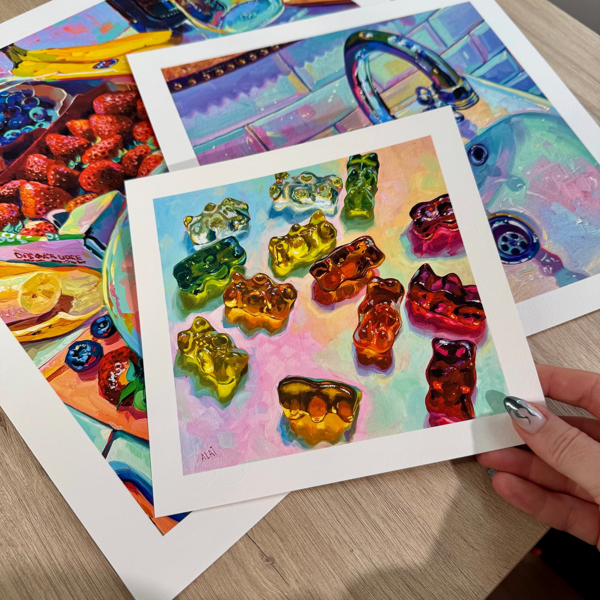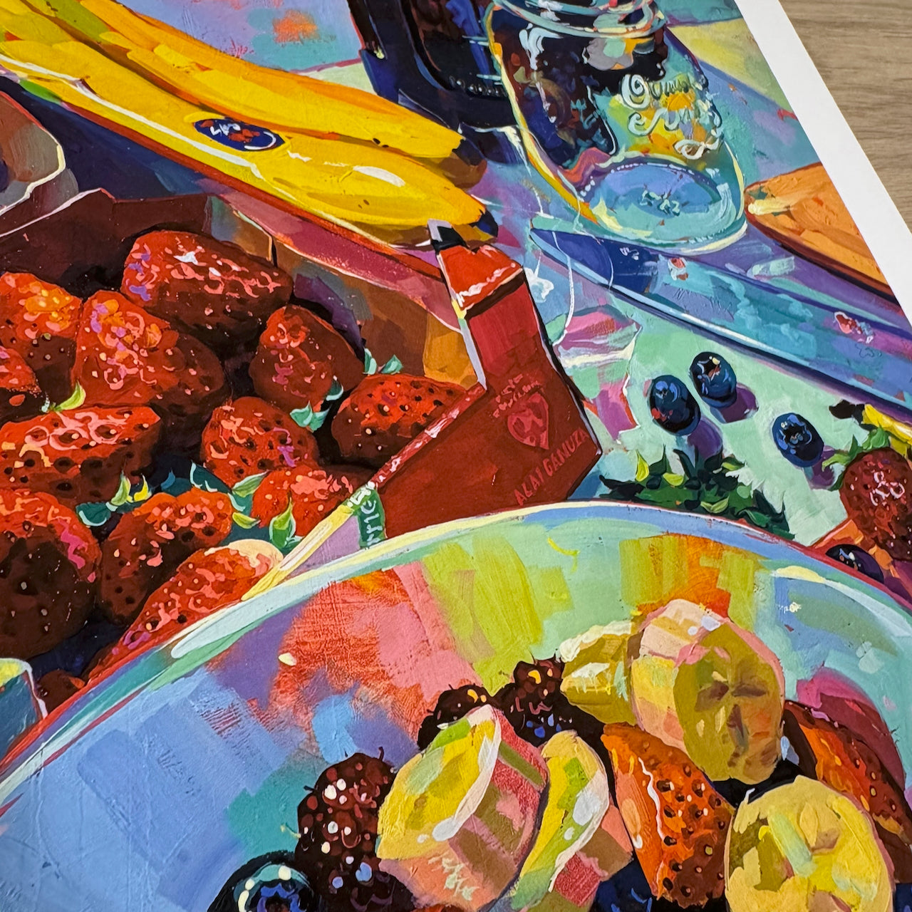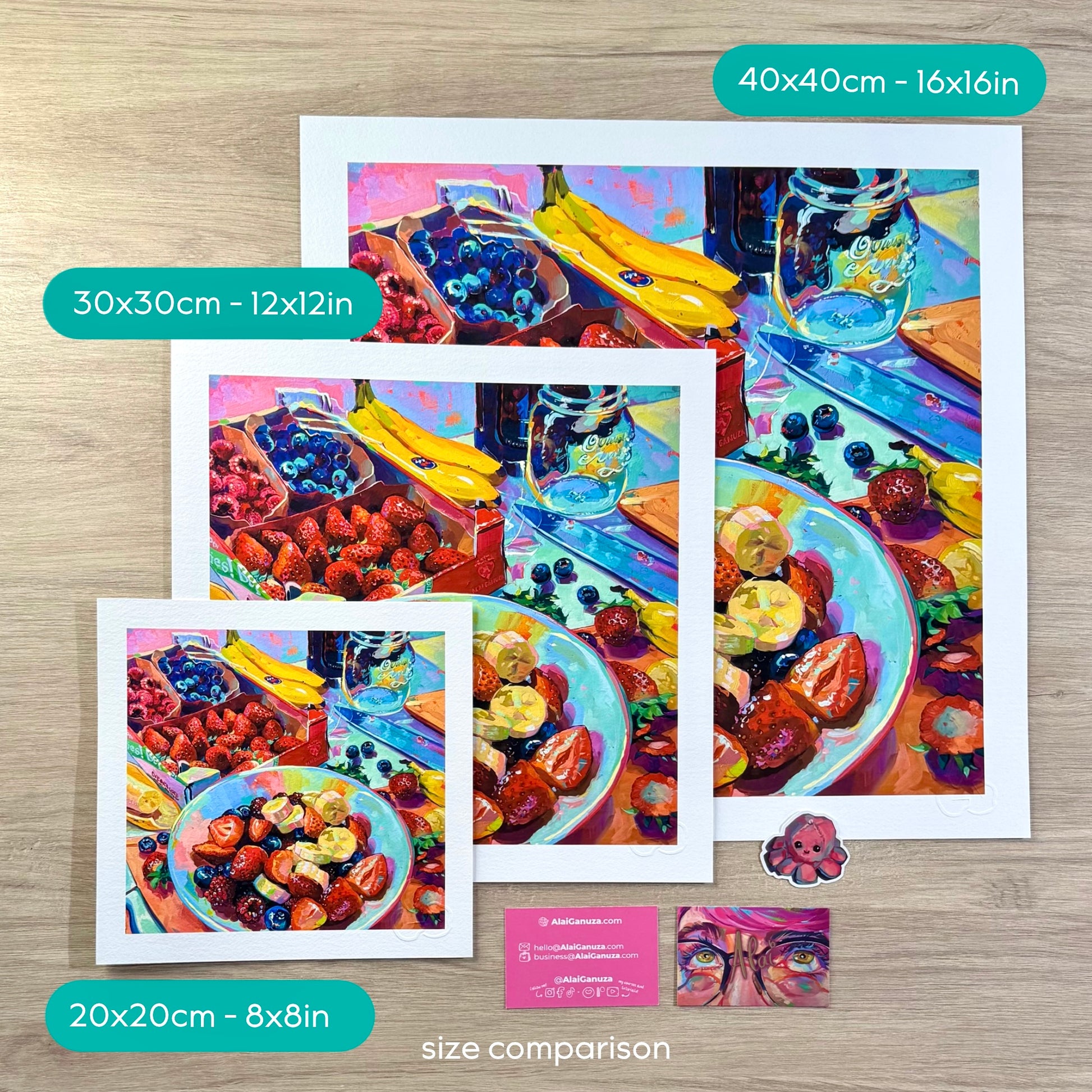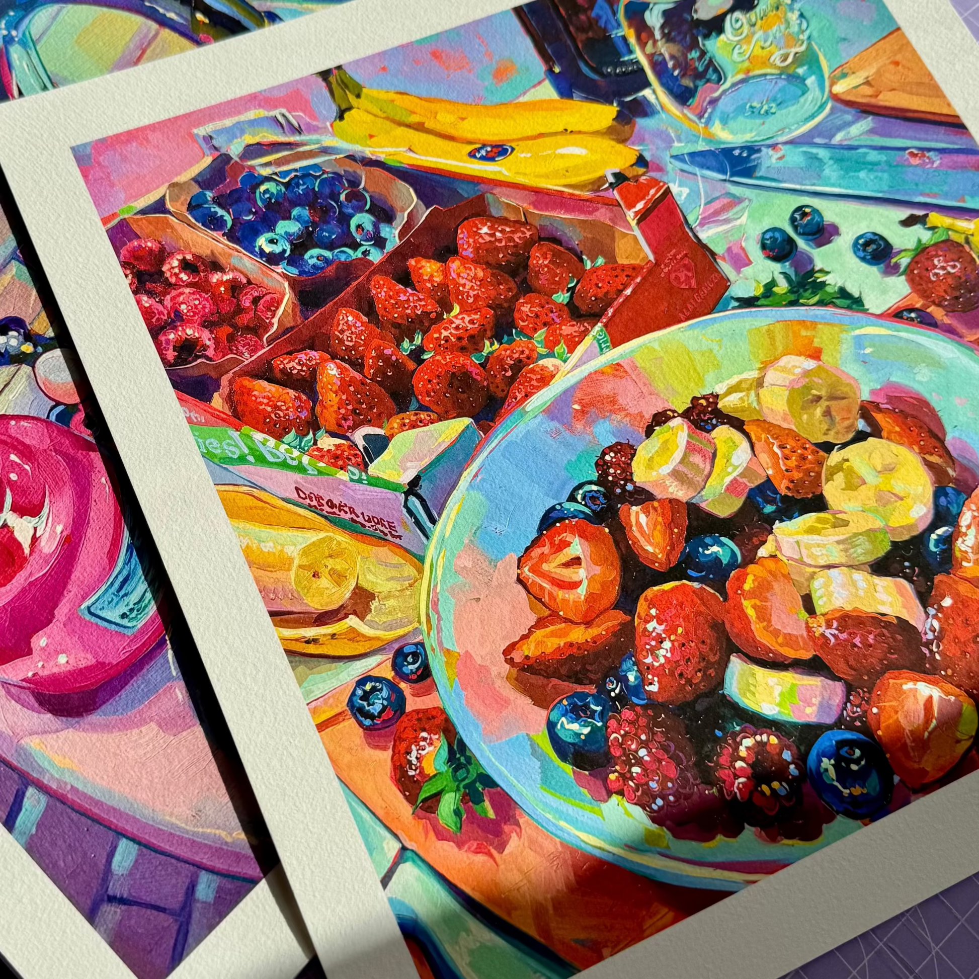Berries are a delight to eat... and to paint! In this painting I wanted to study the order in these super aesthetic and set up boxes but also the chaos of the macedonia in the bowl. Take a look at the not-so-hidden signature in the box! Get it now as a renewed print.