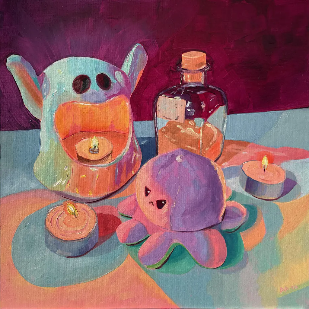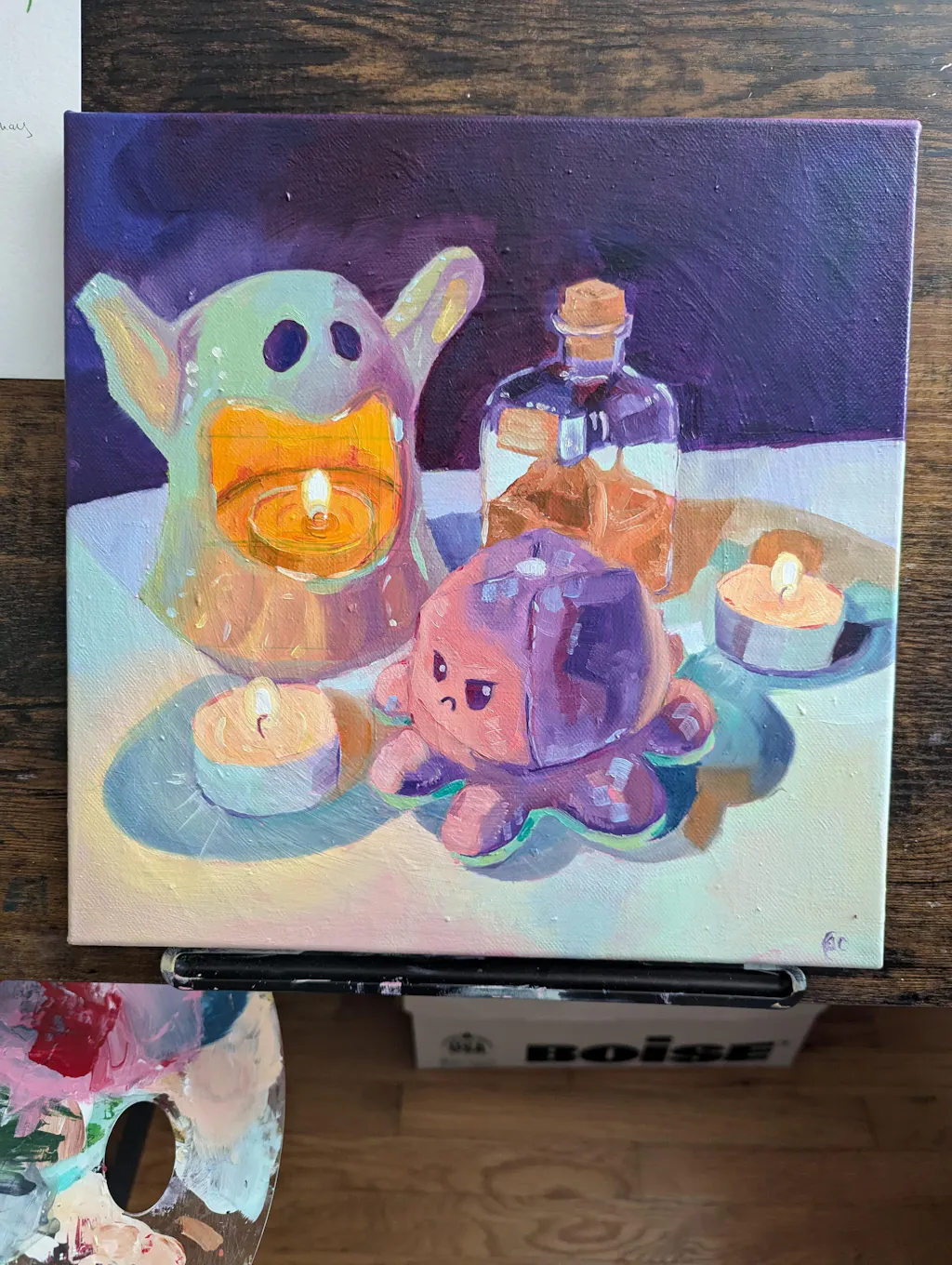 The workshop started with some colour theory and then a warmup mini-painting. The main painting was Halloween-themed and included multiple light sources and types of objects (glass, ceramic, fabric, flame etc), so quite challenging but a lot of fun. I have included my painting here.