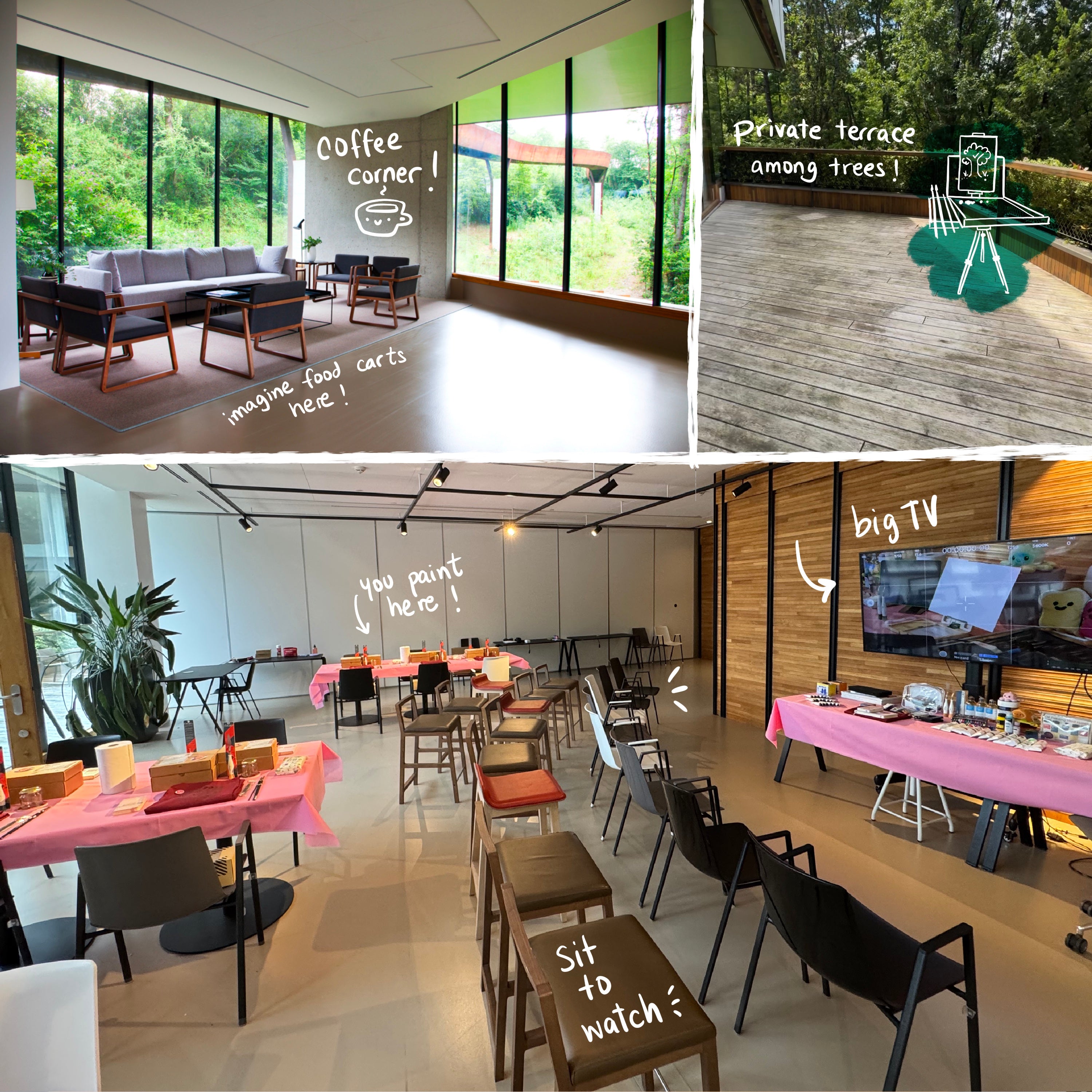 We will have a private studio exclusively for our group, complete with a large outdoor terrace surrounded by forest, a dedicated cleaning area, and a cozy snack/coffee corner with sofas and chairs. The studio will be available to us throughout the retreat, so you can paint even outside the scheduled sessions if you wish.