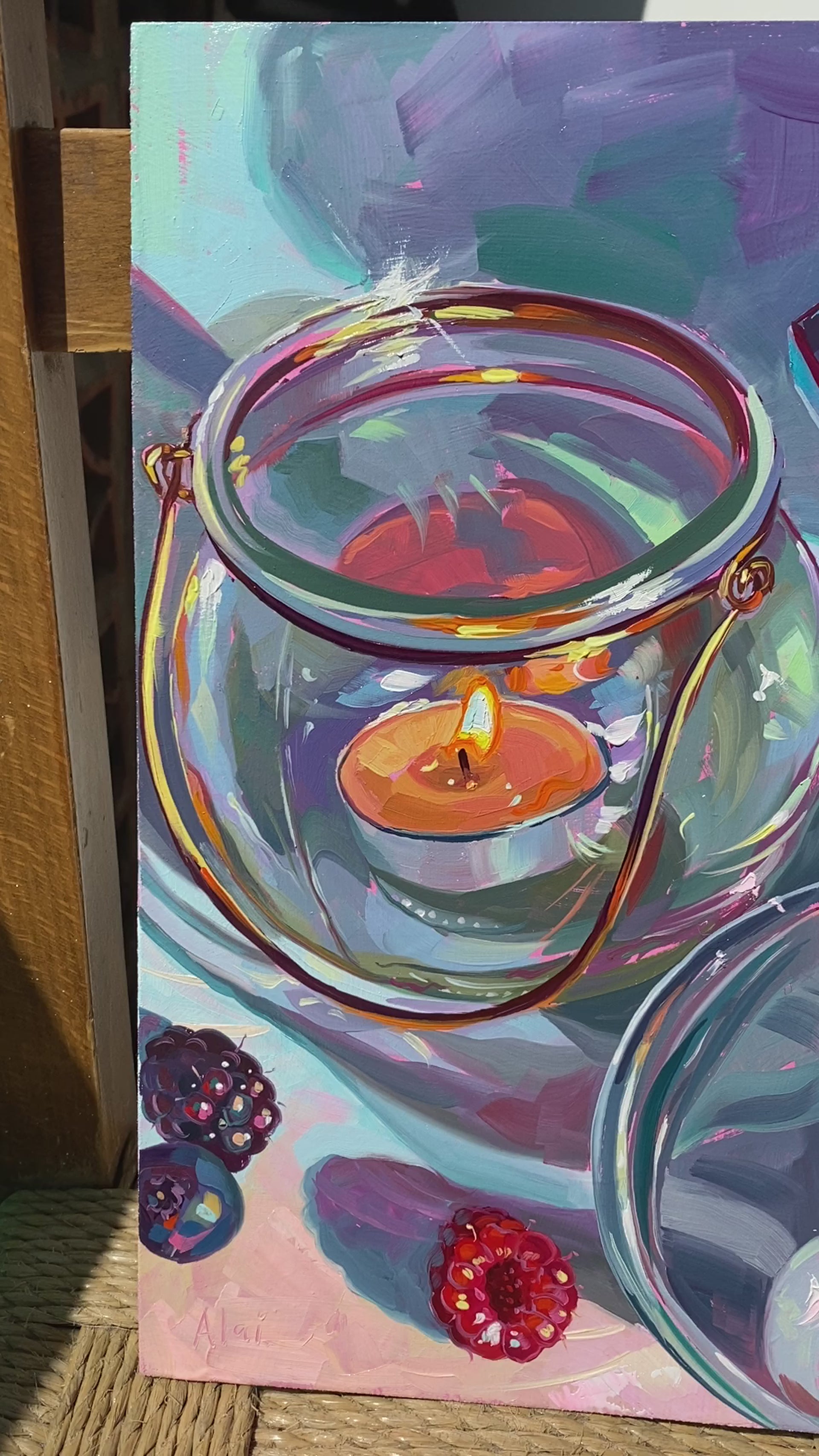 Painted on a generous 30x30 cm (12x12 inch) handmade primed wood panel, this piece beautifully showcases the magic of colorful light and shadow. Alai's signature thick impasto brushstrokes bring incredible, tactile texture to the plump berries, while simultaneously capturing the complex, colorful warped reflections bouncing through the clear glass objects. It is a bright, inviting centerpiece perfect for a kitchen, dining room, or a cozy breakfast nook.