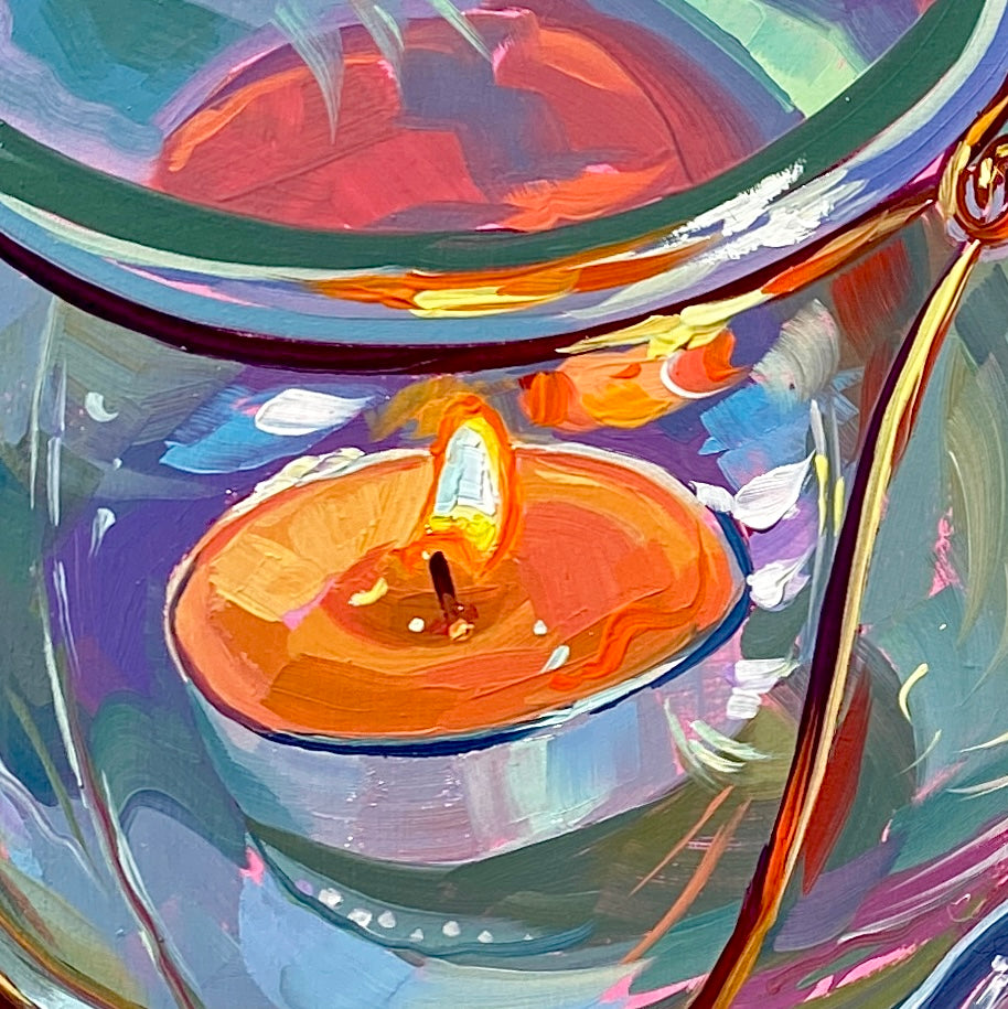 "Berries and coffee cozy breakfast" is a radiant original oil painting that perfectly captures the comforting ritual of a relaxed morning. The composition invites you in with a clear glass mug resting on a saucer, filled with a warm, creamy beverage and a resting metallic spoon. Beside the coffee sits a round glass holder cradling a softly glowing, lit tealight candle. Completing the feast is a small bowl overflowing with fresh jewel-toned raspberries, blackberries, and blueberries, with a few extra berries playfully scattered across the highly textured pastel table.