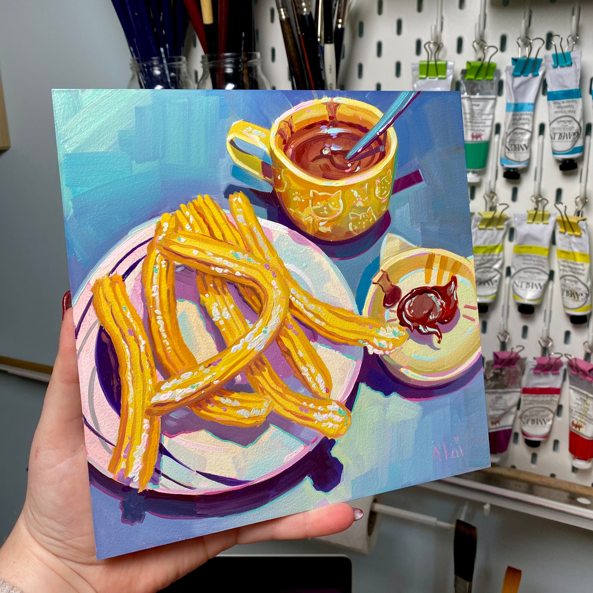 Chocolate con Churros - Original Oil Painting - Spanish Dessert Art - 8 inches