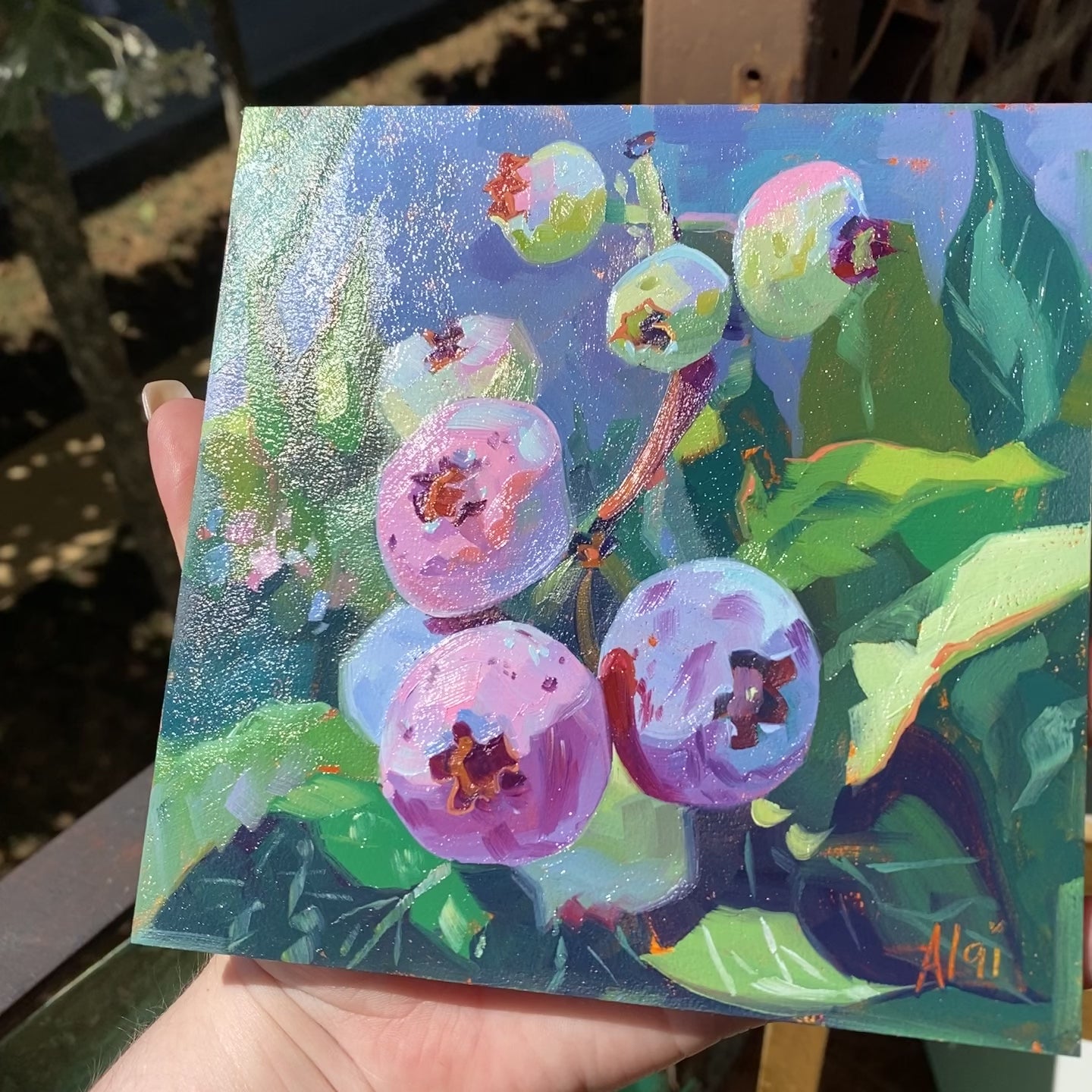 Painted on a petite 15x15 cm (6x6 inch) Trekell hardboard panel, this artwork hides a warm, energetic secret beneath its cool exterior: a vibrant orange underpainting. If you look closely at the edges of the green leaves, the stems, and the shadows of the berries, you will see flashes of this fiery base layer peeking through, giving the entire piece a luminous, vibrating depth. It is a brilliant, joyful addition to any kitchen, sunroom, or gallery wall.