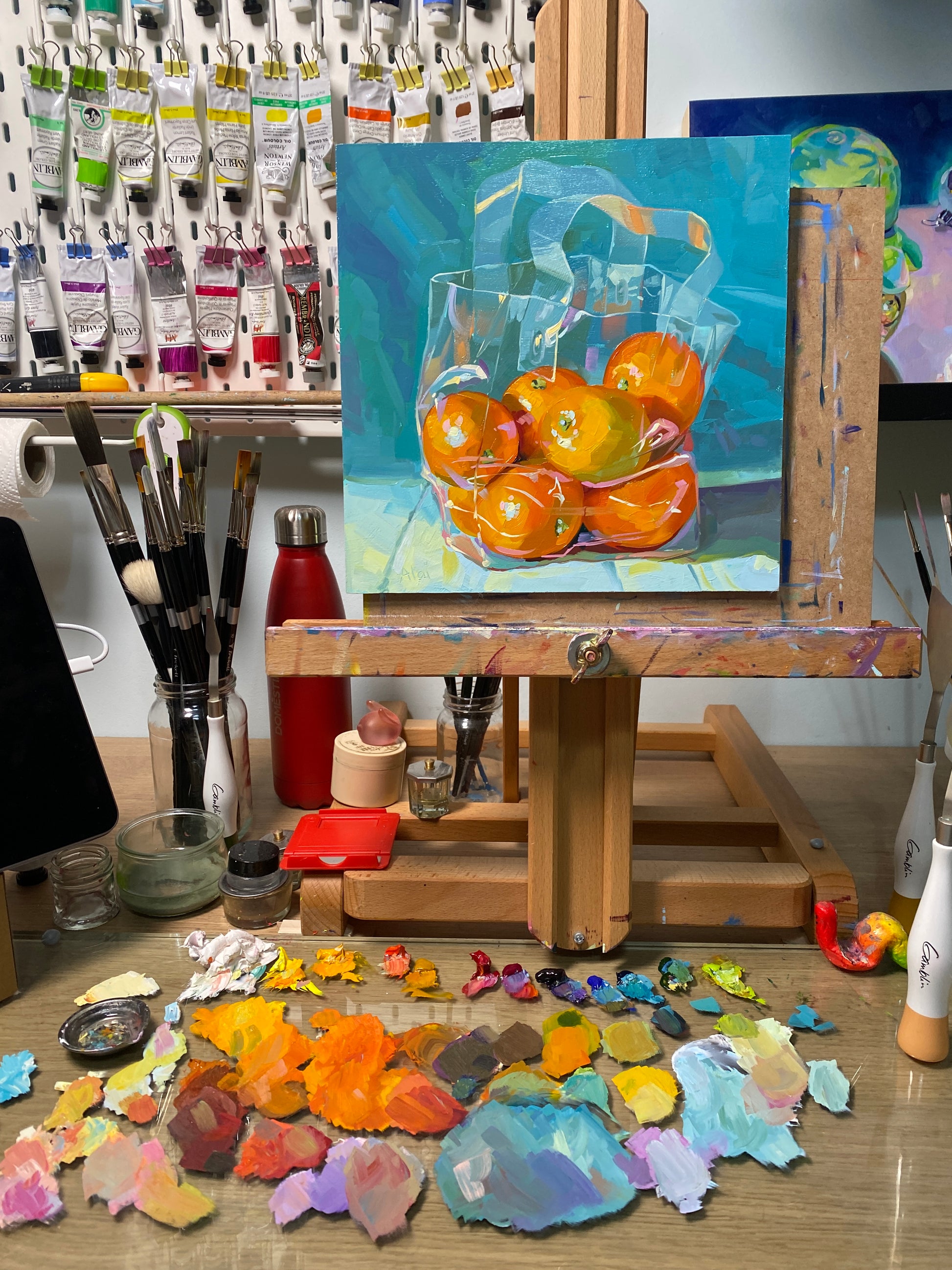 "Oranges in a Bag" is a vibrant original oil painting that masters the challenge of transparency. Based on a reference by Bryan Mark Taylor, the artwork features a mesh-style clear plastic tote bag filled with bright, juicy oranges (or mandarins). The fiery orange tones of the fruit vibrate intensely against the cool, saturated teal background, while white and blue highlights expertly create the illusion of the crinkled, reflective plastic material.
