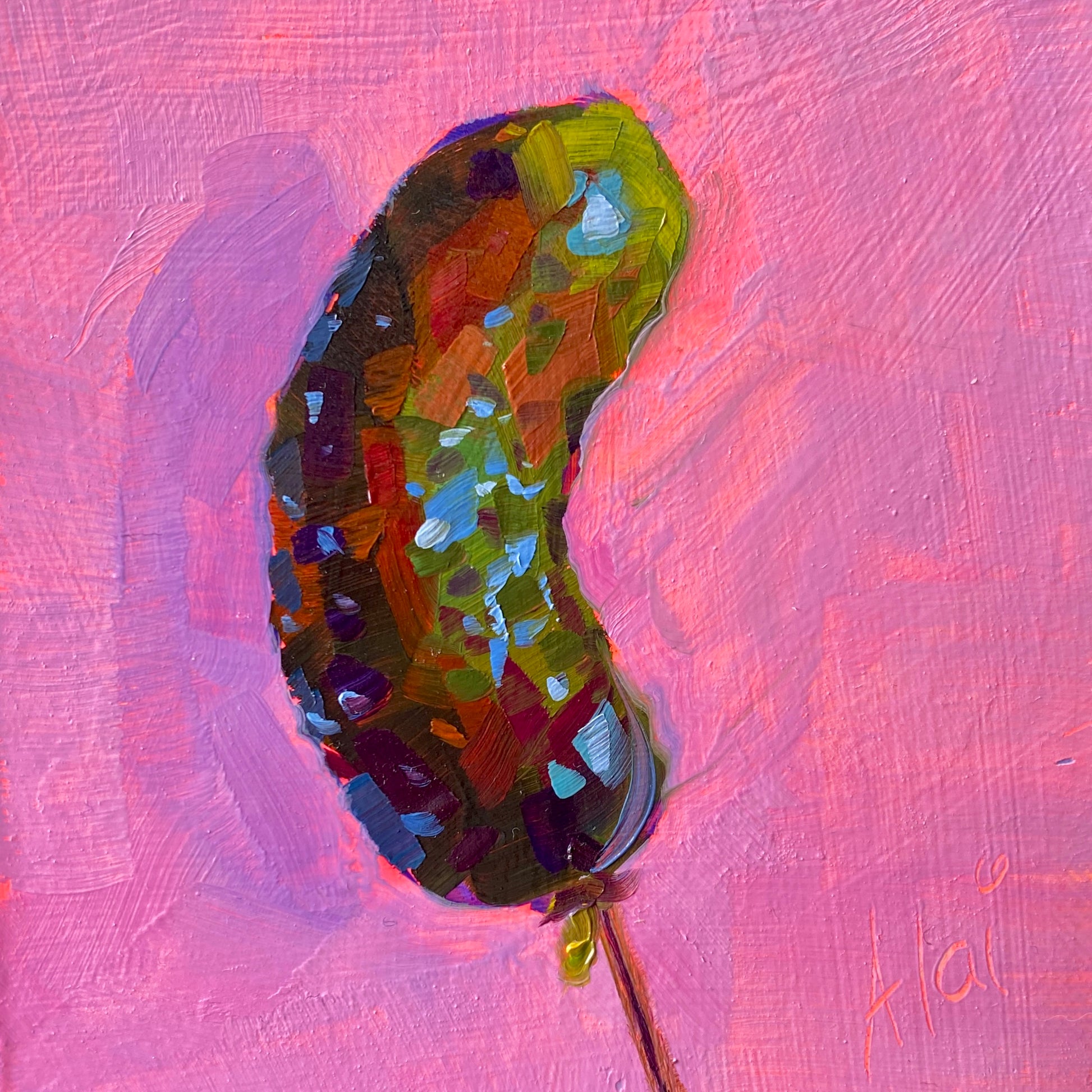 "Pickle" is a bite-sized original oil painting that packs a punch of color and humor. The composition features a single, crunchy pickle on a stick, painted with a complex array of greens, earthy reds, and electric blue highlights that give it a glistening, textured appearance. This savory subject stands out boldly against a sweet, vibrant bubblegum pink background.